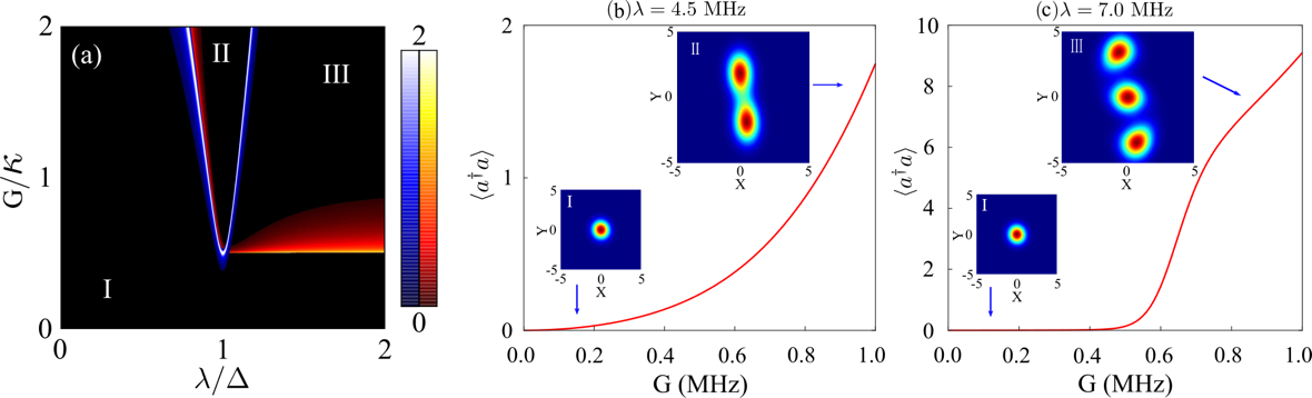 图2: (a) 腔内光子数涨落。区域I、II、III分别表示正常相、超辐射相和正常相与超辐射相共存的相。(b)、(c)不同耦合强度下腔内光子数随光参量放大的非线性增益系数的关系,以及各相对应的Wigner函数分布。