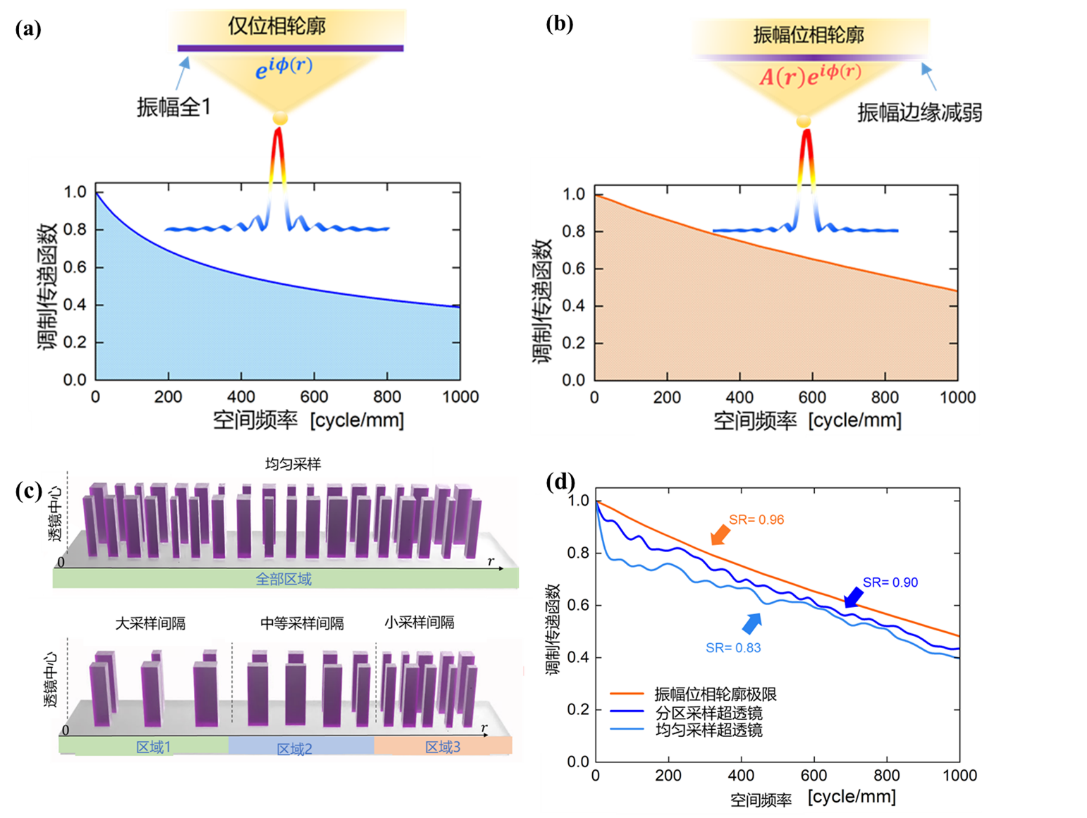 由人工亚波长结构单元构成的超表面对电磁波的振幅、位相有强大的调控能力,有希望同时实现理想透镜的振幅和相位匹配。但是由于大数值孔径超构透镜中单元结构之间的强耦合,使得实现完美的振幅匹配几乎不可能实现,所以长期以来的超构透镜大多基于仅相位轮廓的设计。这种仅位相型的超构透镜随着数值孔径的增大,调制传递函数遭受严重的下降,成像质量和聚焦效率迅速恶化。一直以来,如何在大数值孔径下实现高调制传递函数是大数值孔径超构透镜领域的重点研究问题。
