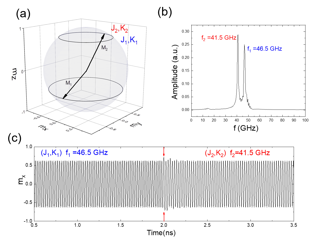 该论文从反铁磁材料体系具有THz超快磁激发特性中获得启发,通过构建人工反铁磁材料结构(SAF)替代传统的单层铁磁层作为STNO中的自由层,并采用电流(STT效应)和电场(VCMA效应)协同调控的设计思路;理论上采用旋转坐标系的分析技巧,结合微磁学仿真技术,建立了如何实现高频和稳定的自旋波信号激发的理论框架,设计了二进制等辐调频(FSK)微波信号的可行性方案。论文提出的STNO器件结构图如图1所示。SAF结构自由层具有垂直磁各向异性,该各向异性可以通过施加电场来调控其大小。不同的电流和电场组合可以驱动磁矩M1和M2在不同轨道上绕z轴进动,磁矩进动的频率与电流相关,进动振幅与轨道(mz)相关。通过电流和电场的协同控制,可以在同一进动轨道(mz)上实现不同频率的磁矩进动,如图2所示,因此,可以实现二进制频移键控调制技术。该研究为自旋微波振荡器的器件研发提供了新思路,具有实际意义和理论价值。