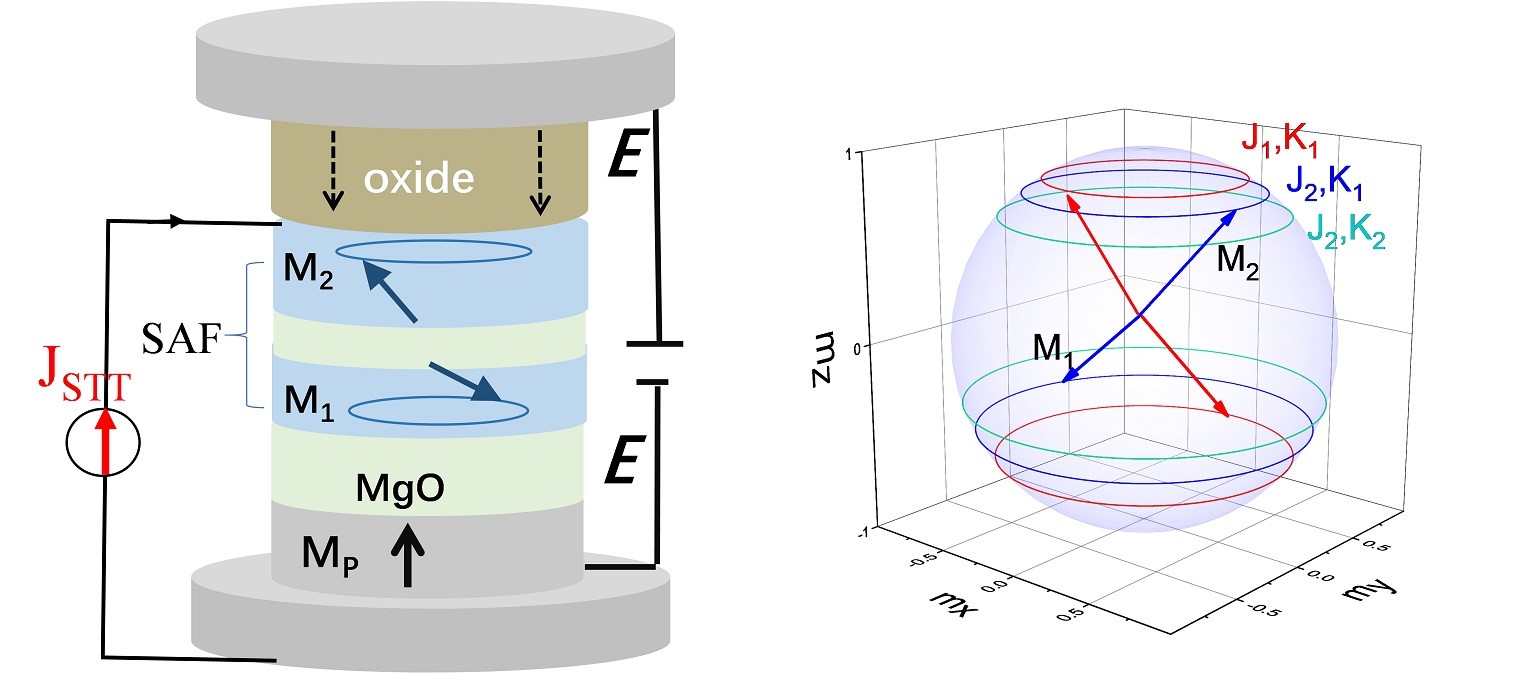 图1.电流和电场协同调控的自旋转矩纳米振荡器示意图,SAF结构自由层磁矩的进动轨道
