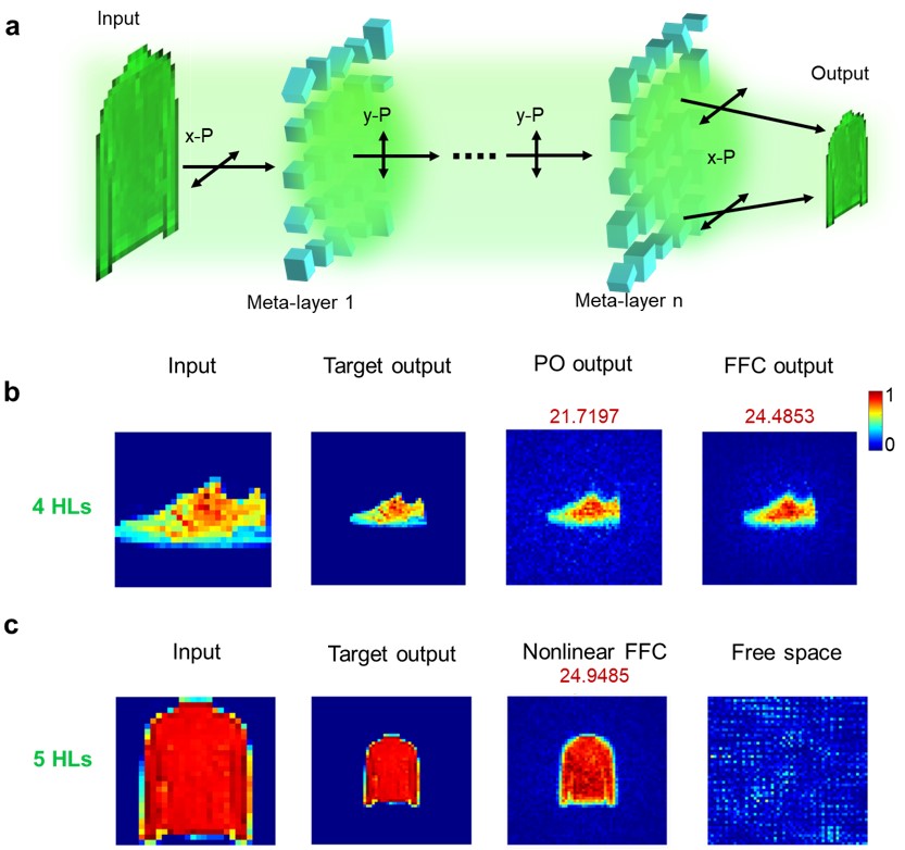 作为概念验证,首先将FONM设计为一个分类器,可以识别0到5的手写数字,如图3a所示。该器件是通过电子束直写和原子层沉积工艺制作完成,其顶视和剖视SEM结果如图3b所示。以数字“4”的输入为例,测试了网络的输出,如图3c所示,结果表明最大的光强被聚焦在对应的正确区域,识别是成功的。