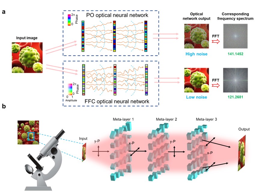 图1 (a)纯相位光网络和FONM对比,(b)三维架构FONM成像仪