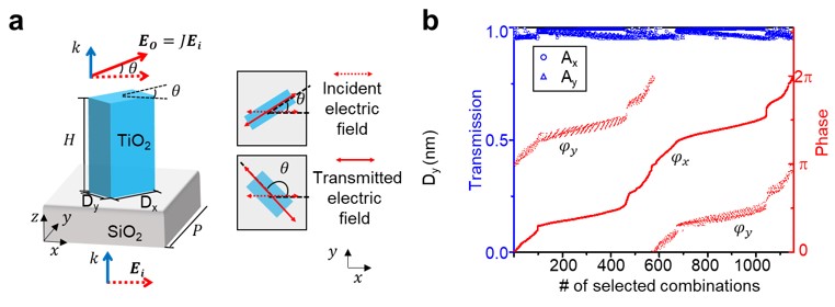 为了在FONM中实现任意且独立的振幅和相位调制,文章采用矩形双折射纳米柱结构,如图2a所示。在x偏振光入射和y偏振光出射时,满足振幅匹配和相位差匹配,匹配结果如图2b所示,此时光通过超表面的输出可以简化为,此时振幅和相位可以分别由θ和φx独立且任意地调控。