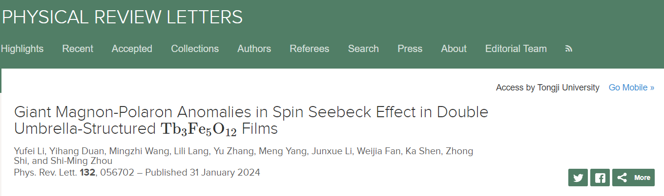 近日,8b角球比分-足球角球比分直播 时钟教授和北京师范大学物理系沈卡教授联合在磁振子输运领域取得新进展,研究成果以“Giant Magnon-Polaron Anomalies in Spin Seebeck Effect in Double Umbrella-Structured Tb3Fe5O12 Films”为题发表在物理学领域顶级期刊《物理评论快报》(Physical Review Letters)上。