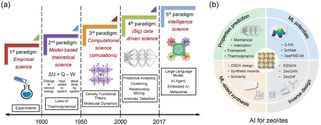 图1、(a)材料科学的五个范式:经验科学、基于模型的理论科学、计算科学、数据驱动科学和智能科学;(b)AI在复杂多孔结构领域所取得进展的四个主要部分