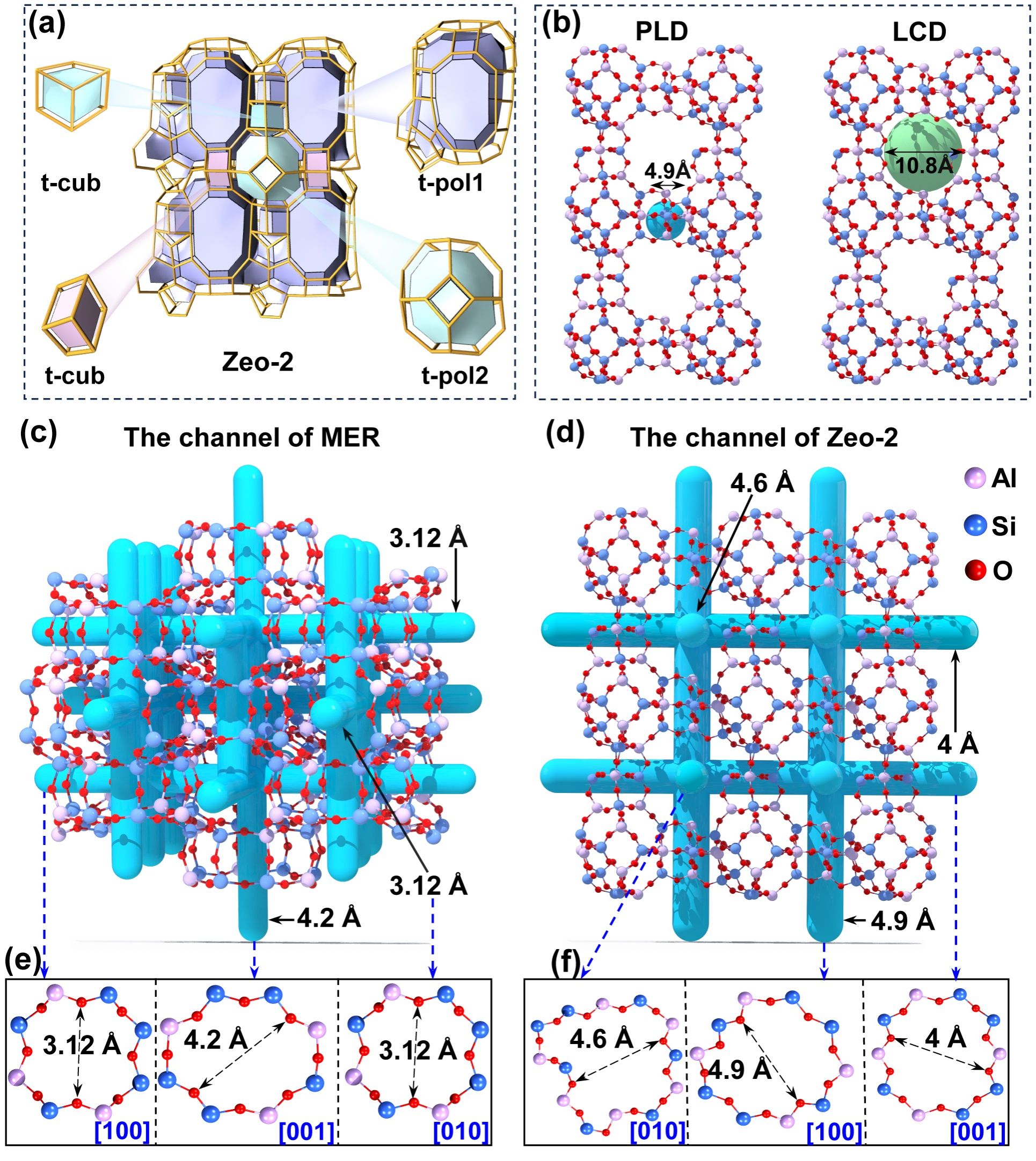 研究发现了一个迄今为止具有最大钾离子吸附容量的沸石类晶体结构(如图2所示的Zeo-2结构),并有潜力应用于钾盐提取、高钾血症治疗、钾型化肥等多元化应用领域。团队进一步结合第一性原理计算和特征分析,揭示了高钾离子选择性的来源,为高钾离子选择性多孔结构的机制理解与设计提供了新思路。