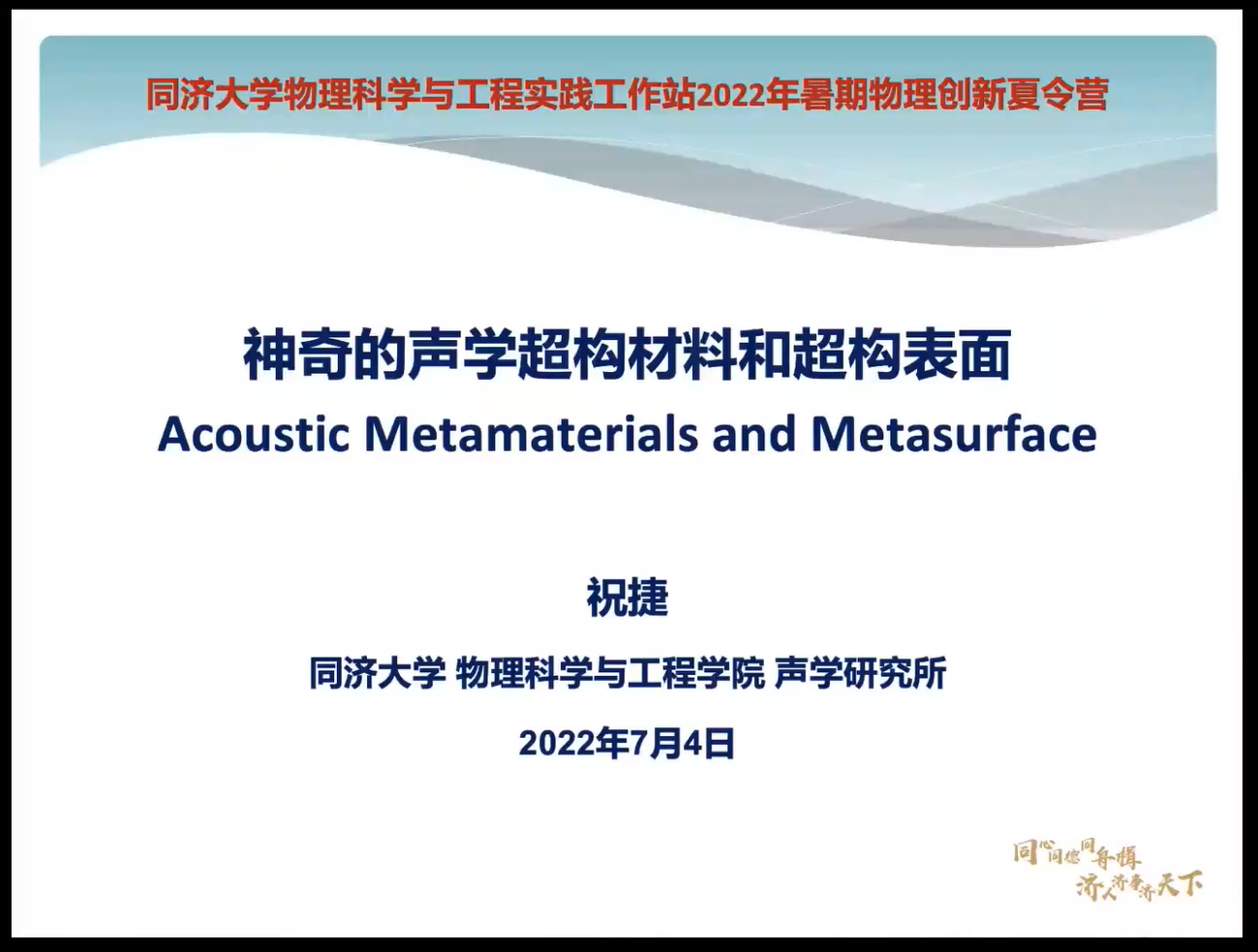 本次夏令营开营活动邀请到国家高层次人才、8b角球比分-足球角球比分直播 祝捷教授进行了以“神奇的声学超构材料和超构表面”为题的科学讲座。祝捷教授主要从事物理声学、声学超构材料、超构表面及其前沿交叉学科领域的基础研究和应用探索,现任中国材料研究学会超材料分会理事、中国声学学会物理声学分会和教育声学分会委员等职。祝捷教授从中国传统文化入手用接地气的语言向同学们介绍了声学发展历史、声波基本原理以及超构材料和超构表面的研究发展,并介绍了同济大学声学研究所取得的一系列科研成果。报告结束后祝教授与同学们在线进行了热烈的讨论和交流。