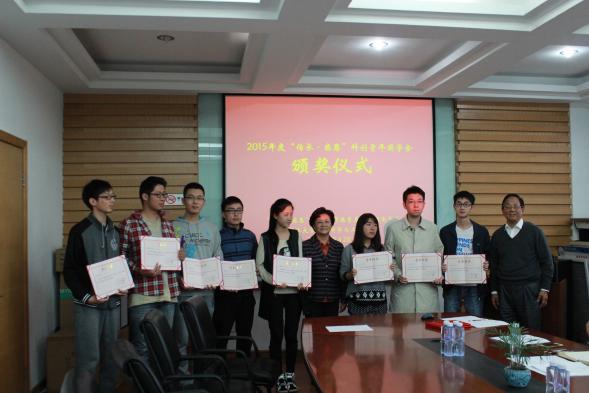 品学兼优、具有优秀的科研能力的学生,下设教育基金管理委员会每年评选10名学生,每人获得6000元的奖学金资助。2015年度奖学金评选工作,基于科创评分细则,最终评选出周煜杰、杨可洲、师延理、陈泽、袁晨光、黄亦丞、魏秋实、习爽等8名本科生和张琰卿、叶天明等2名研究生。