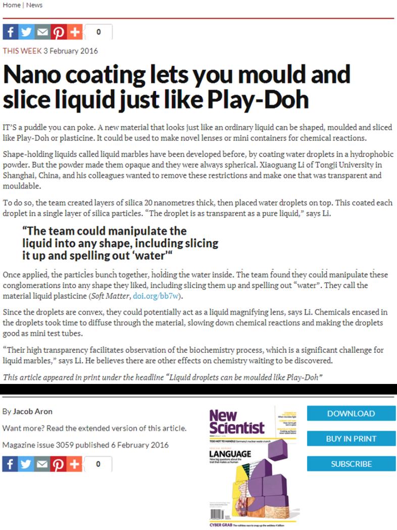 of droplets with interfacial nanoparticle jamming, Soft Matter, 2016, 12, 1655”, 被选为该杂志第12卷第6期的封面,并引起了著名学术评论媒体的关注,先后被《New Scientist》杂志和Discovery频道报导。