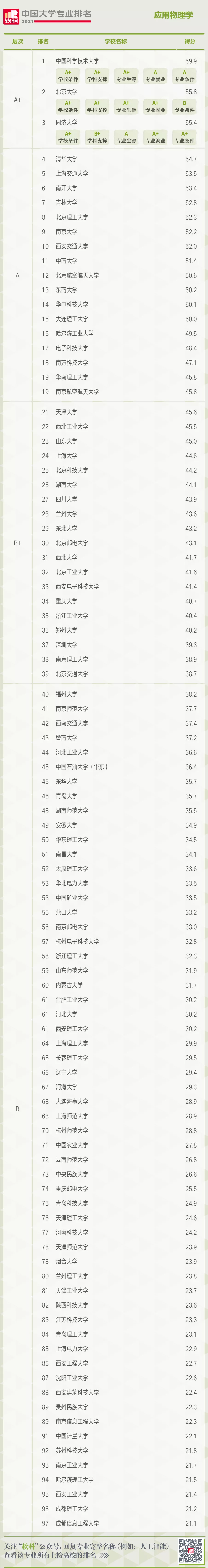 2021年6月22日,高等教育评价专业机构软科正式发布2021“软科中国大学专业排名”中,应用物理学专业共有97所高校上榜,其中“8b角球比分 应用物理专业”位列A+层次,高校全国排名第三位。