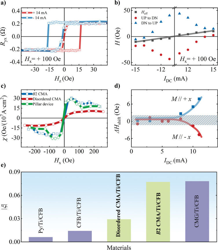 在自旋输运中,自旋霍尔效率(ξ)是衡量自旋输运中材料产生自旋流能力大小的关键参数,其数值越大,材料产生自旋流的能力越高效。本研究通过高质量CMA外延薄膜的制备,深入探索了CMA的自旋输运性能,并揭示了其增强自旋流的物理机制。研究团队在Ti/CoFeB/MgO多层膜结构中利用CMA产生的自旋流,成功实现了具有垂直磁各向异性CoFeB薄膜的电致磁化翻转。特别地,即使在无外加磁场的条件下,仍然观测到磁化翻转现象。这表明CMA能产生具有面外极化的自旋流,其来源可归因于铁磁体的固有反常自旋霍尔效应。其次,通过优化器件结构,将Hall bar中间区域制备为圆柱体,显著减弱了大电流测量中的边缘效应,从而将磁化翻转比例大幅提升至90%。这一优化为电致磁化翻转测量提供了新的设计思路。最后,该工作利用反常霍尔回线偏移表征了CMA的ξ。研究发现,相比于无序结构的CMA,有序CMA中具有更大的ξ。这一结果表明,晶体结构的有序性对于增强自旋流至关重要,为设计高性能自旋电子材料提供了重要指导。