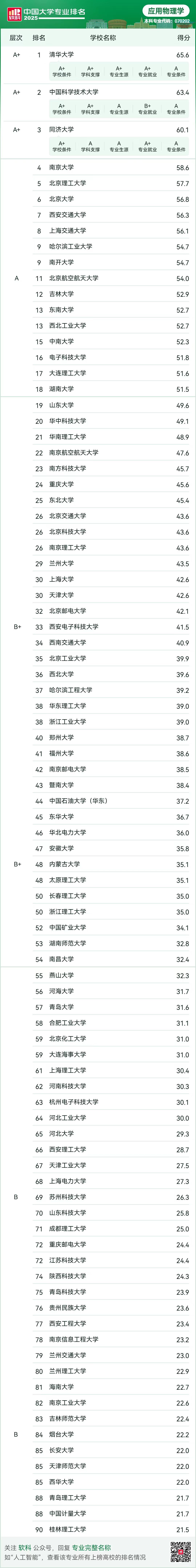 在应用物理学专业排名中,共有90所高校上榜,8b角球比分 “应用物理学”专业位列A+层次,高校全国排名第三位。