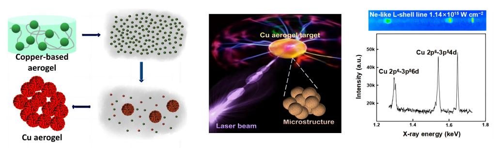 该研究通过结合无机分散溶胶凝胶法、醇热还原及纳米金属钝化等技术,制备出具有低密度(<900 mg/cc)、高孔隙率(>89.96%)、高纯度(>99.76%)及抗氧化性(空气中保持60天仍保持单质态)的单质铜气凝胶多孔材料。该铜气凝胶被应用于神光II背光源靶诊断实验,成功提升了高能激光脉冲照射下靶材料的体加热效果。与高纯度铜箔靶相比,铜气凝胶靶在K壳层上发射的X射线能量高出近18%,且大幅降低了L壳层能谱的噪音信号。该工作为高纯度、高稳定性的金属单质气凝胶以及高效激光-X射线转化背光源靶材料的设计提供了新思路。