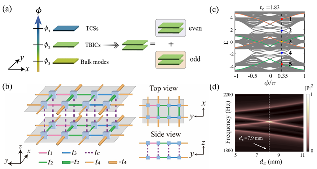 图1(a)MTCIC构造原理示意图(b)紧束缚模型的双层结构原胞示意图(c)开放边界条件下数值计算的本征能谱(d)本征频谱随层间耦合管截面宽度的演化过程